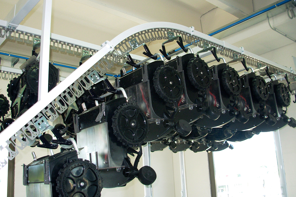 The customer is given a personal card containing all the barcodes associated with the delivered items; once washed and ironed, the garments are hung on the appropriate conveyor belt. In this way, the simple reading of the card with the barcode reader automatically activates the conveyor belt, which delivers the garments to the customer in only a few seconds.